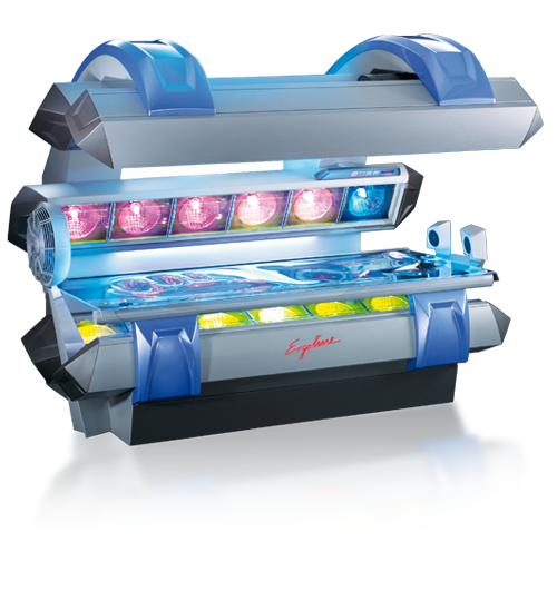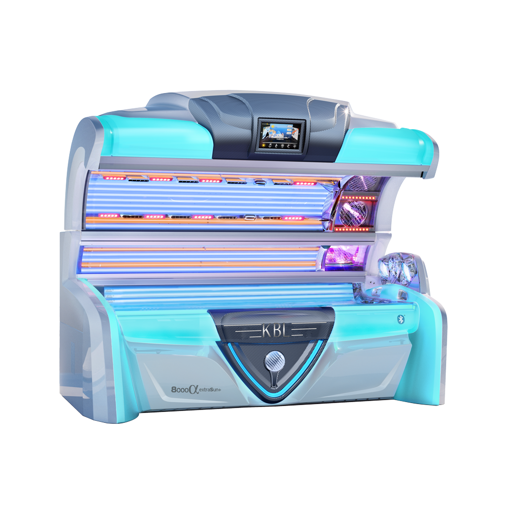 Features 56 intensive sun-light lamps with an extra-high percentage of UVB for increased pigment development, including 70 LED BeautyBooster HyperRed red lights, air conditioning, AquaCool water mist, aroma, bluetooth, music vibration and more! Tan time is 10 minutes.